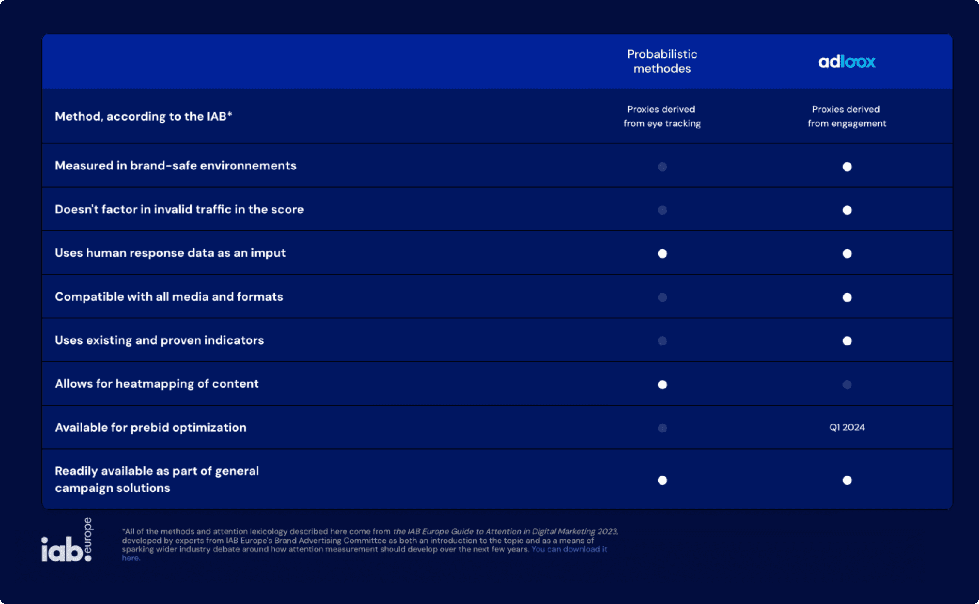 We're unwavering in our stance to maintain the integrity of our methods, avoiding the blending of approaches as distinct as direct measurement and panel-based studies. While the industry grapples with two primary methods, according to the IAB, our approach stands apart as the deterministic one, leveraging proxies derived from engagement and industrial criteria. Our groundbreaking methodology, known as the Adloox Attention Score, harnesses metrics such as active time-in-view, interaction, scrolling speed, and more, to provide you with the most comprehensive understanding of advertising attention.