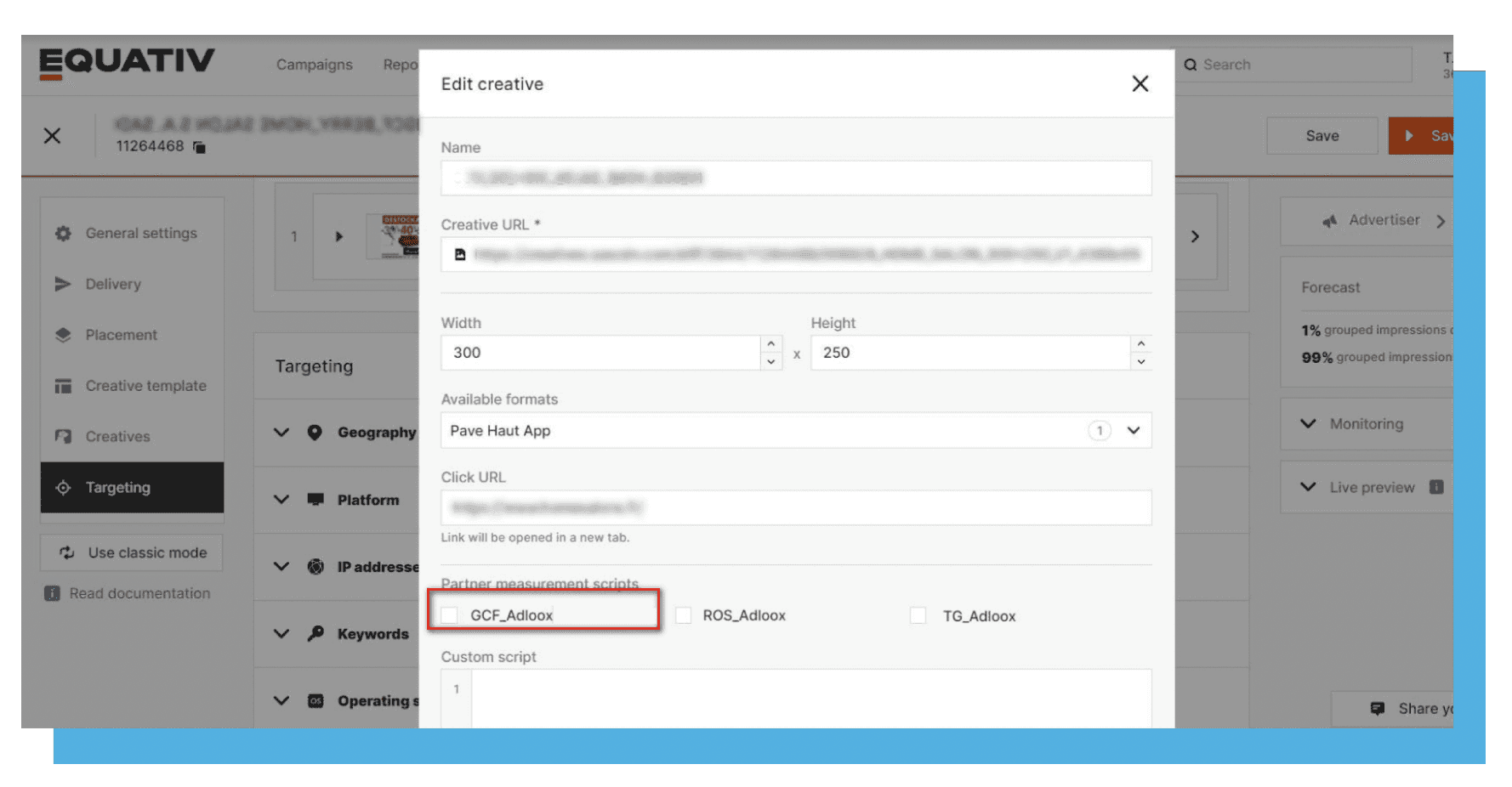 Now, an Adloox opt-in is directly available in the Equativ tool, at the request of the client. This allows their teams to select a partner measurement script (Adloox) when editing a creative, directly inside Equativ’s UI.